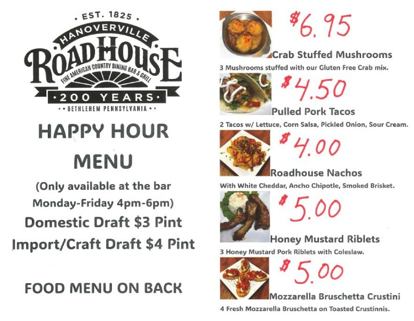 Located in Bethlehem, Hanoverville RoadHouse Bar & Grill is renowned for its culinary excellence and fine American country inspired dishes. Our charming dining room, modern facilities and welcoming atmosphere offers an exceptional dining experience.